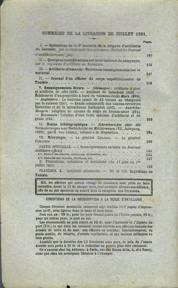 REVUE D'ARTILLERIE TOME XVIII JUILLET 1881 4° LIVRAISON