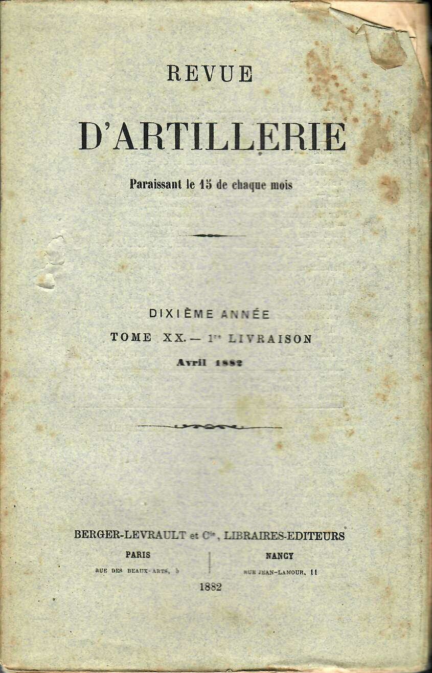 REVUE D'ARTILLERIE TOME XX AVRIL 1882 1° LIVRAISON