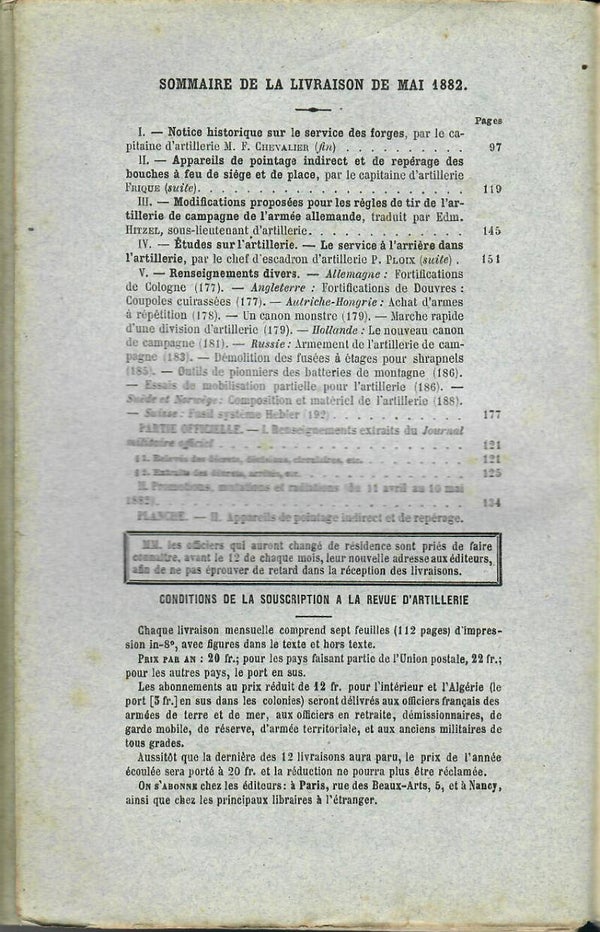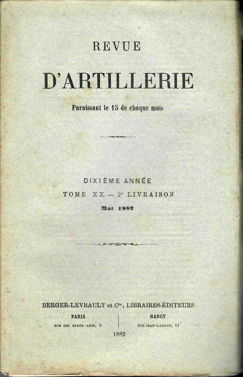 REVUE D'ARTILLERIE TOME XX MAI 1882 2° LIVRAISON