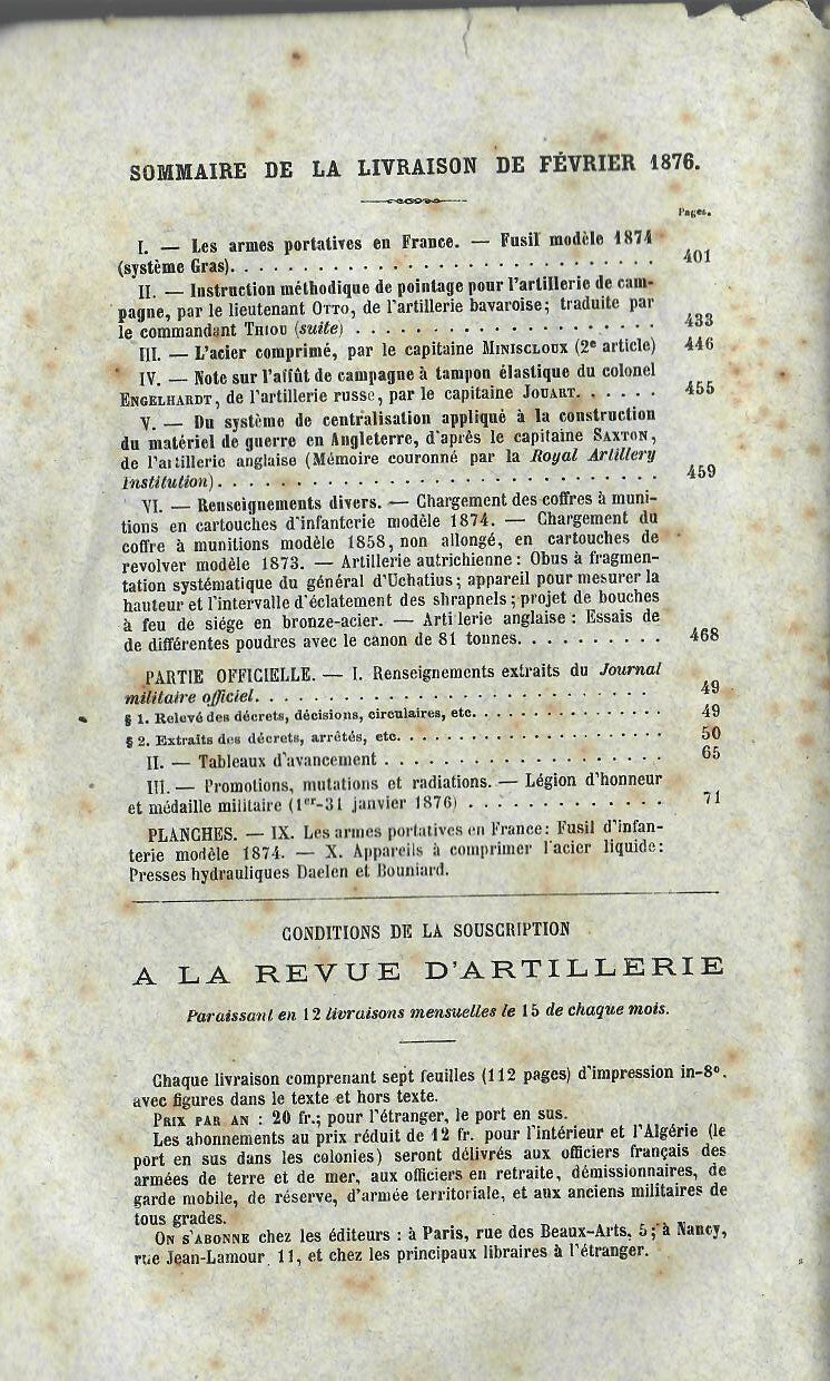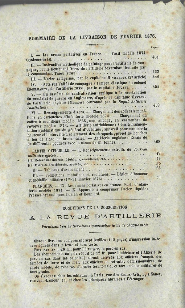REVUE D'ARTILLERIE TOME VII FEVRIER 1876 5° LIVRAISON