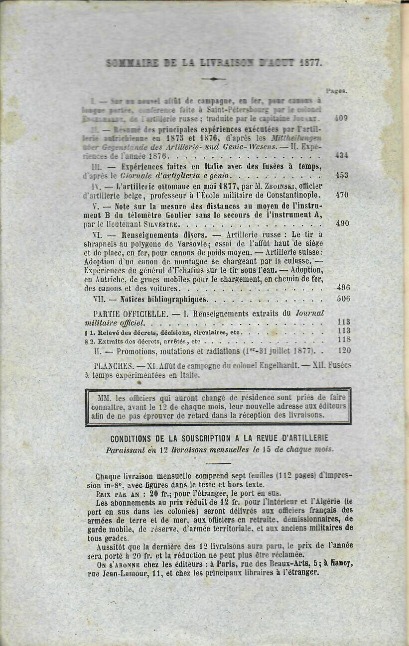 REVUE D'ARTILLERIE TOME X AOUT 1877 5° LIVRAISON