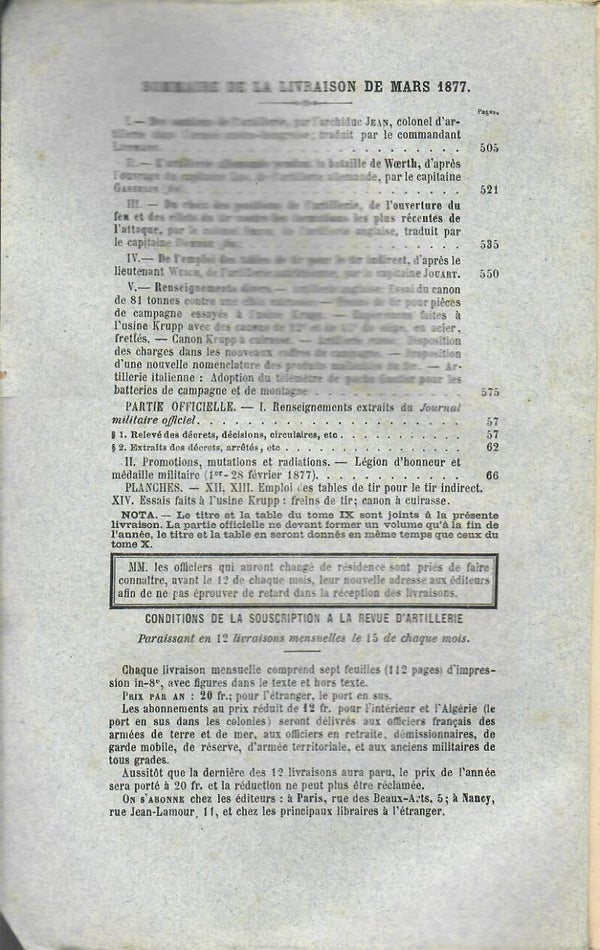 REVUE D'ARTILLERIE TOME IX MARS 1877 6° LIVRAISON