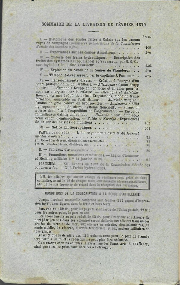 REVUE D'ARTILLERIE TOME XIII FEVRIER 1879 5° LIVRAISON