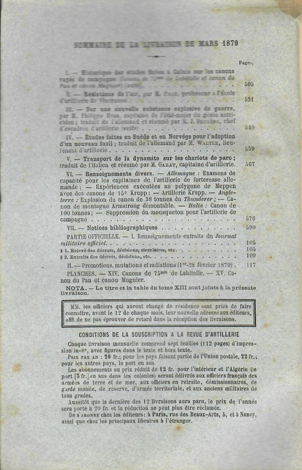 REVUE D'ARTILLERIE TOME XIII MARS 1879 6° LIVRAISON