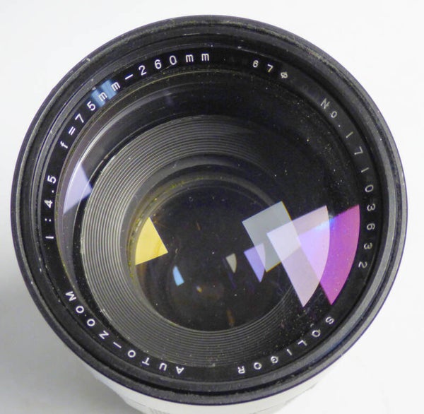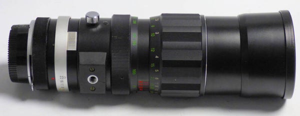 Zoom ouverture constante 4.5 de fabrication Japonnaise robuste des années 60' . Les lentilles sont propres, léger voil sur la lentille arrière. Le fût est parfait, pas de déformation pas de coup.